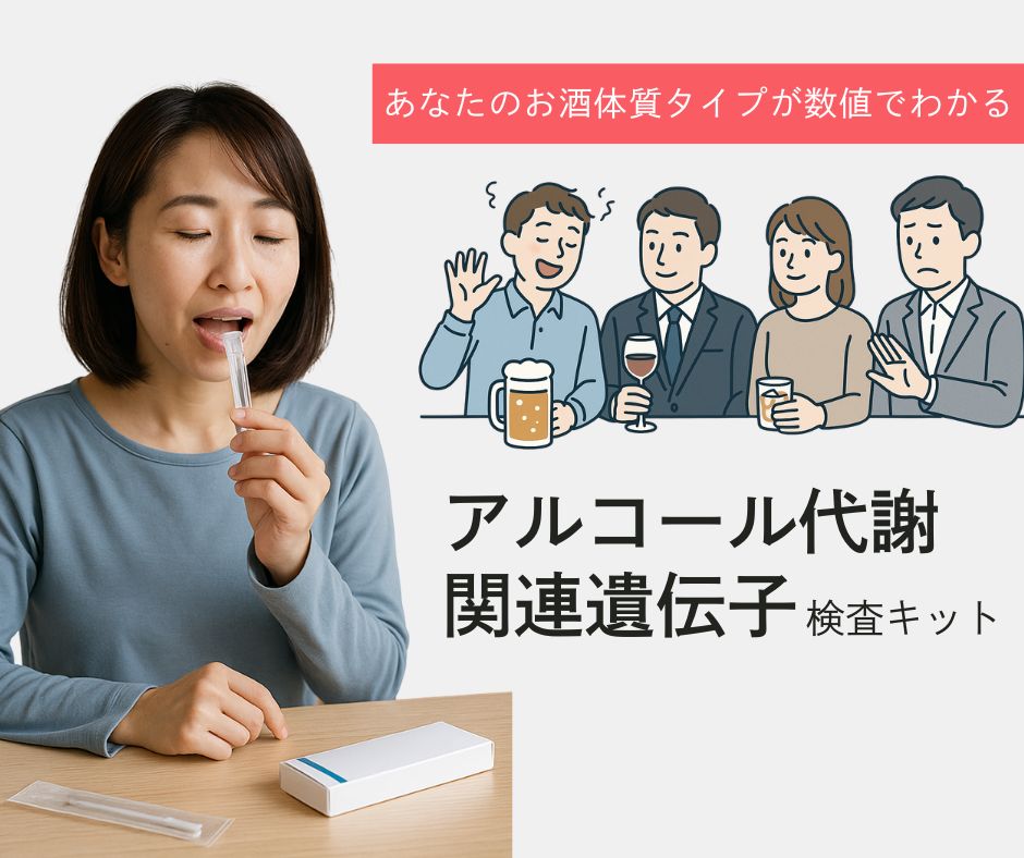 お酒に強い・弱い(残りやすい・依存しやすいなどの)体質を遺伝子レベルで分析。3種類の酵素活性を調べることで、あなたのお酒体質が数値で明確にわかり、付き合い方を考えるきっかけになります。検査結果は日本人以外の方にも適用できます。