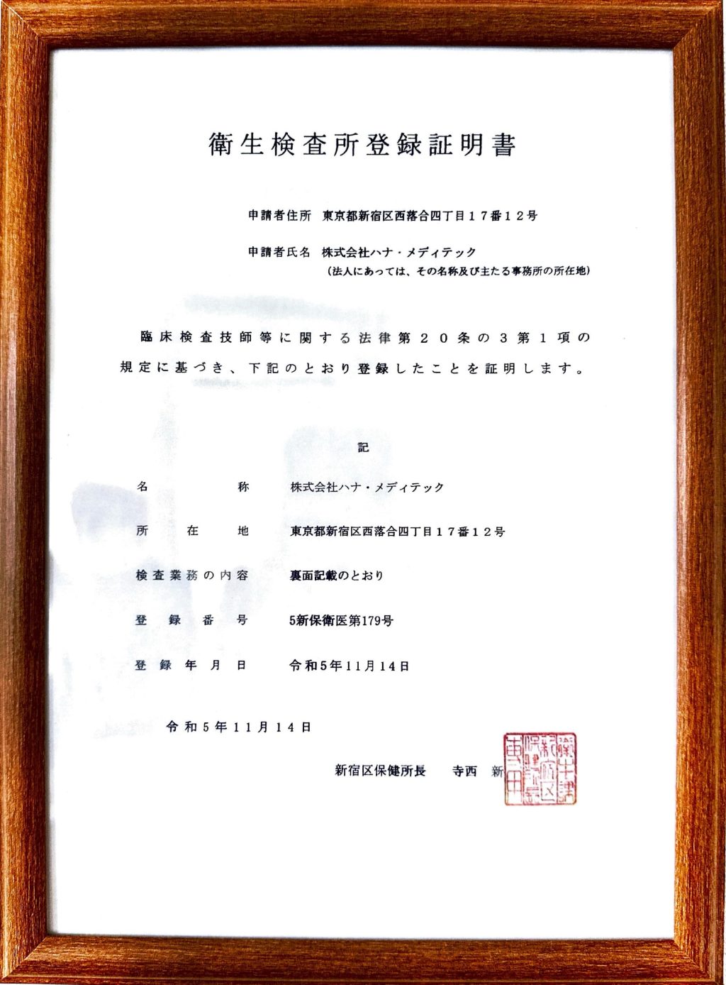 令和5年11月14日付で新宿区保健所より衛生検査所